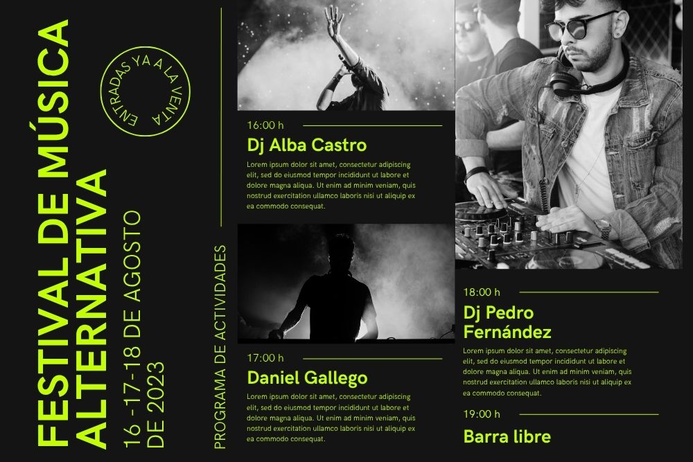 Si no eres diseñador profesional, puedes usar una plantilla de cartel de festival como base. Plataformas como Canva te permiten modificar textos, colores e imágenes fácilmente. Solo asegúrate de que el diseño respire coherencia: tipografía legible, equilibrio visual y un contraste de colores que funcione bien tanto en pantallas como en impresión.